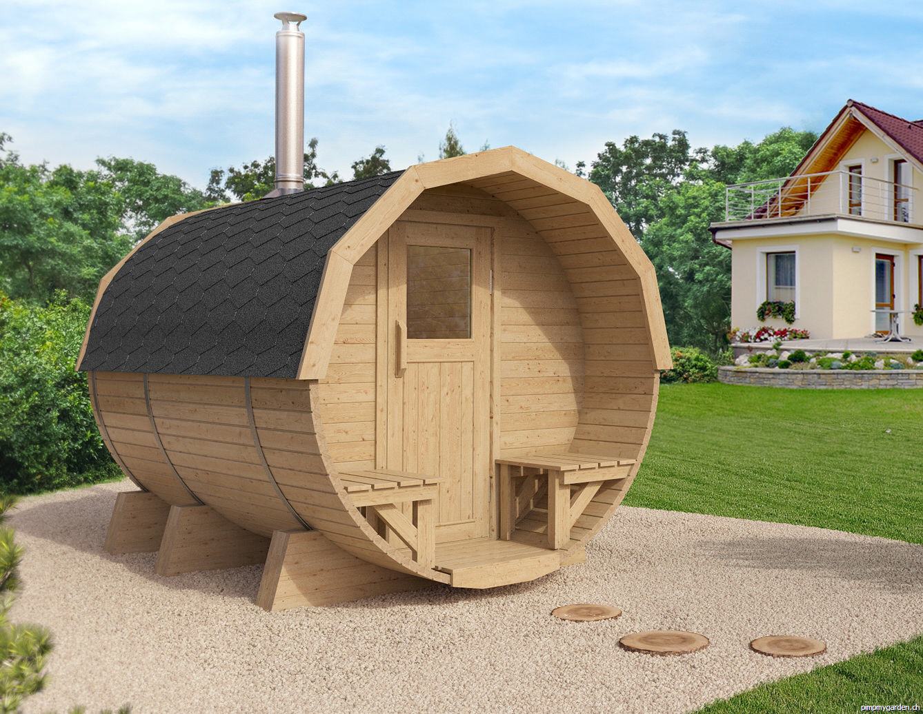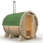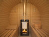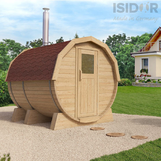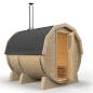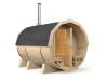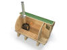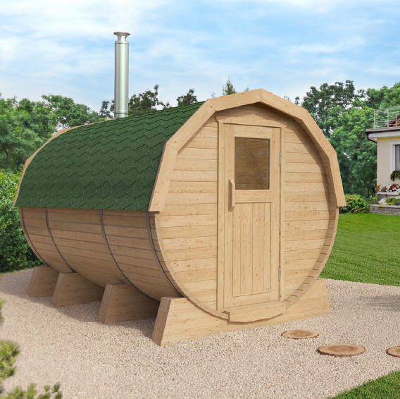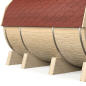 Tonnensauna Inklusive Saunaofen HARVIA M 3 16.5 kW, Dachabdichtung aus Bitumenschindeln und Herausnehmbares Fussbodenrost.